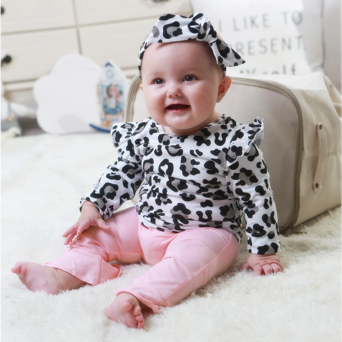 0-24M Newborn Baby Girls Clothing Set Autumn Winter Ruffles Leopard Tops + Pants Headband Outfits I